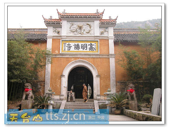 高明讲寺大概(-) 高明讲寺各厅院(二) 高明讲寺外围(三) 高明讲寺,是中国佛教天台宗发展史上的重要寺院,是全国汉族地区佛教重点寺院,智者大师所建天台山十二古刹之一。高明寺现存建筑以三条纵轴线为主体,分15个院落,殿宇共200余间,建筑面积3437平方米,全殿堂院落均用回廊、檐廊、空廊、过厅相联系,形成一个完整的体系。中轴线以照壁、天王殿、大雄宝殿、方丈楼为主要建筑。天王殿面阔五间,单檐歇山式。大雄宝殿面阔五间,通面阔22米,四周以回廊、单檐歇山顶。禅堂位于东轴线,为五开间硬山顶建筑,前作卷棚式轩廊,雕式华丽,是僧众坐禅之所在。另外,还有罗汉堂、西方殿、放生池、佛学院、斋堂、西观寮、不瞬堂、千手观音阁、钟楼等等。高明讲寺已有一千四百多年历史。陈太建年间(569-582),佛教天台宗创始人智觊在此创建幽溪道场。唐名净名,后唐天幼年间始称高明,后唐清泰年间(936)号智者幽溪道场。宋大中祥符元年(1008)改称净名,后复名高明。明万历二十四年(1596)传灯大师募资重修,见大殿僧房,为高明寺之盛期。此后寺院又屡有兴衰。寺院坐落于高明山麓,掩映在茂林修竹之中,四周峰峦叠翠,寺前幽溪横流,环境幽静。四周围名胜古迹遍布:寺前清凉桥畔有明玉禅师笔冢,其东南幽亭下有智者大师“幽 溪”手迹刻石;明传灯有“看之”,明何白书“圆通洞”,清光绪石梁比丘兴慈书,字径650厘米的“佛”字,此外还有“南无阿弥陀佛”,“一心念佛,即是菩提”,“松风”,“伏虎”“持念”等摩崖。附近还有看云亭,香谷岩,灵响岩,观音洞,巾子岩小石梁诸景